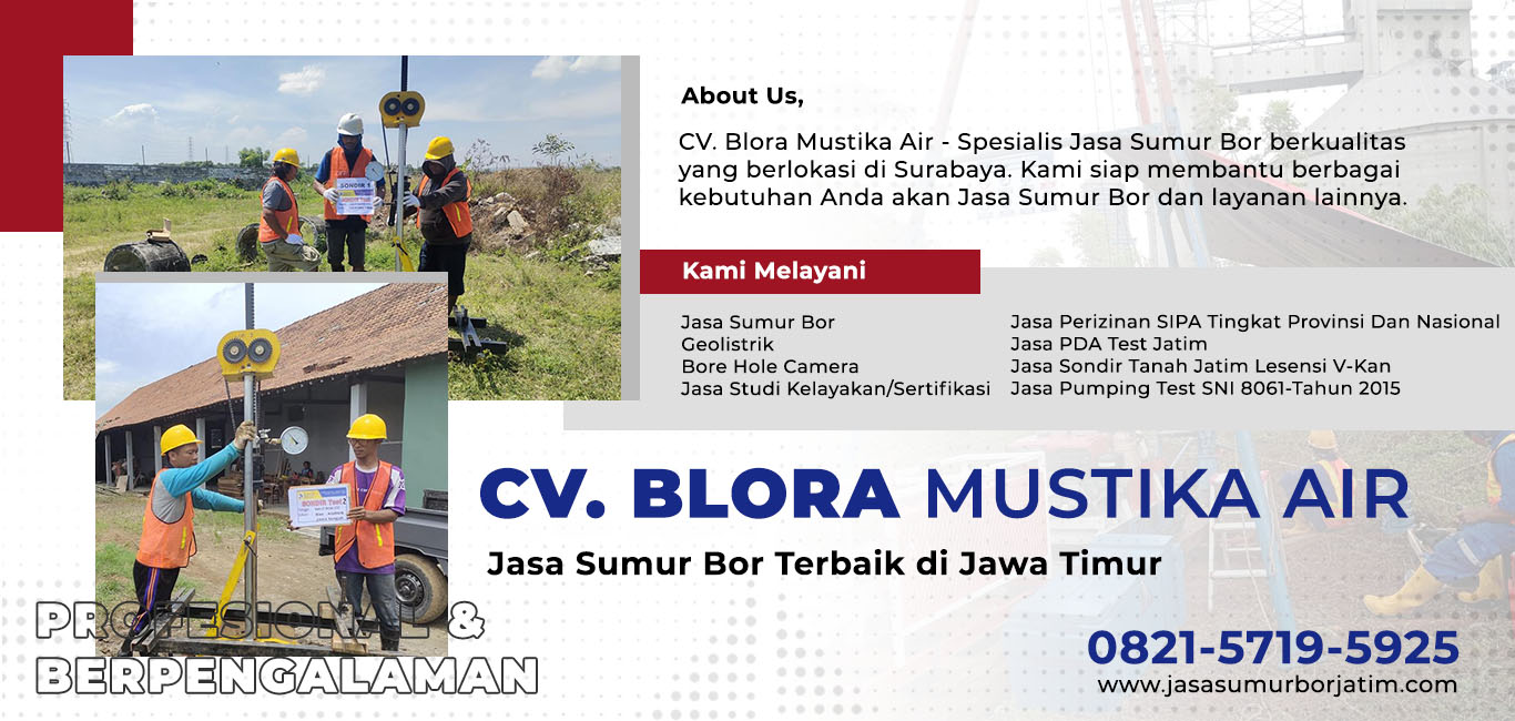 CV. Blora Mustika Air adalah perusahaan yang bergerak dibidang Jasa Sumur Bor profesional. Berlokasi di Surabaya Jawa Timur, kami hadir sebagai Jasa Sumur Bor dengan layanan terlengkap yang kami tawarkan dengan biaya yang sangat kompetitif.